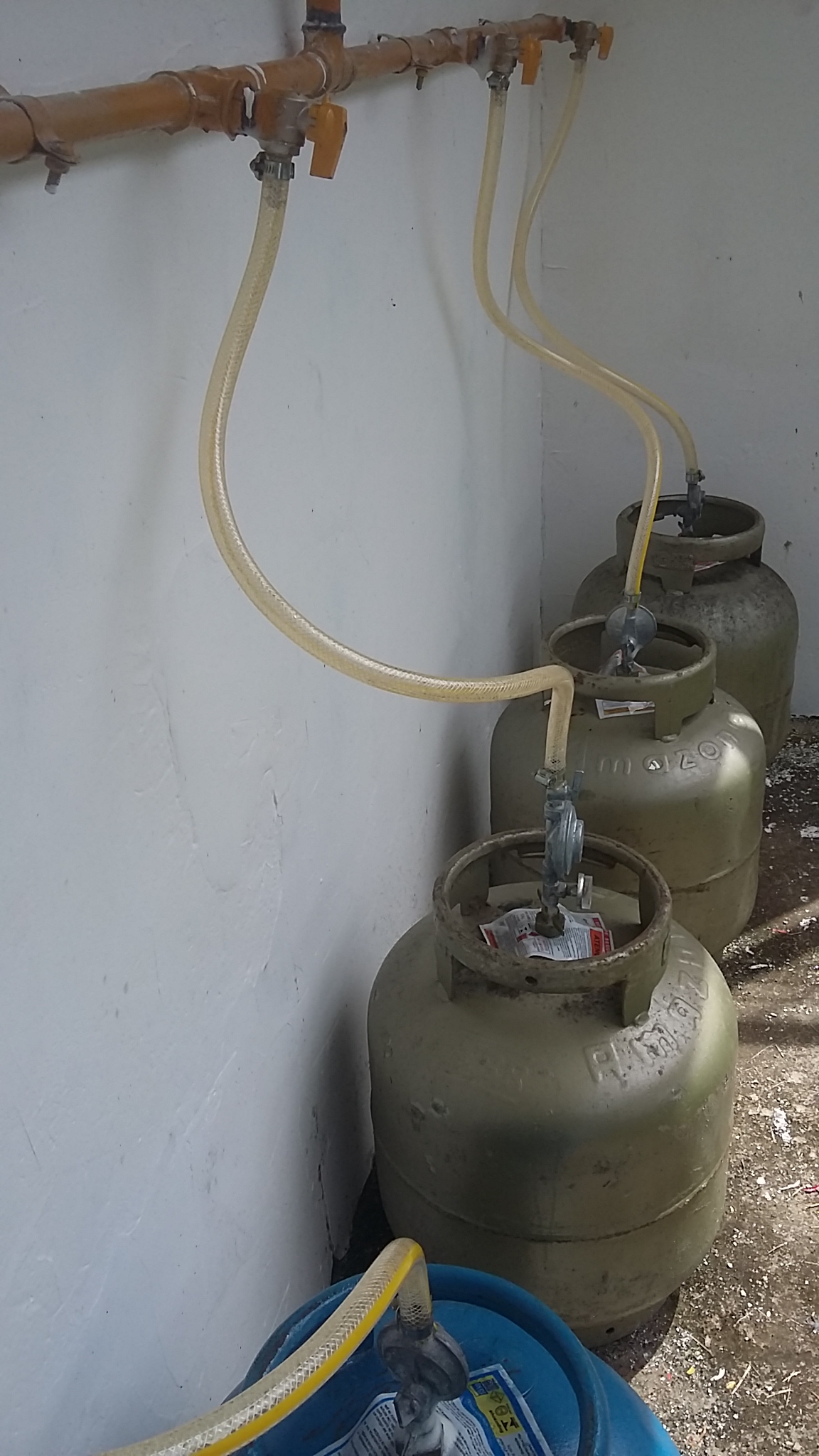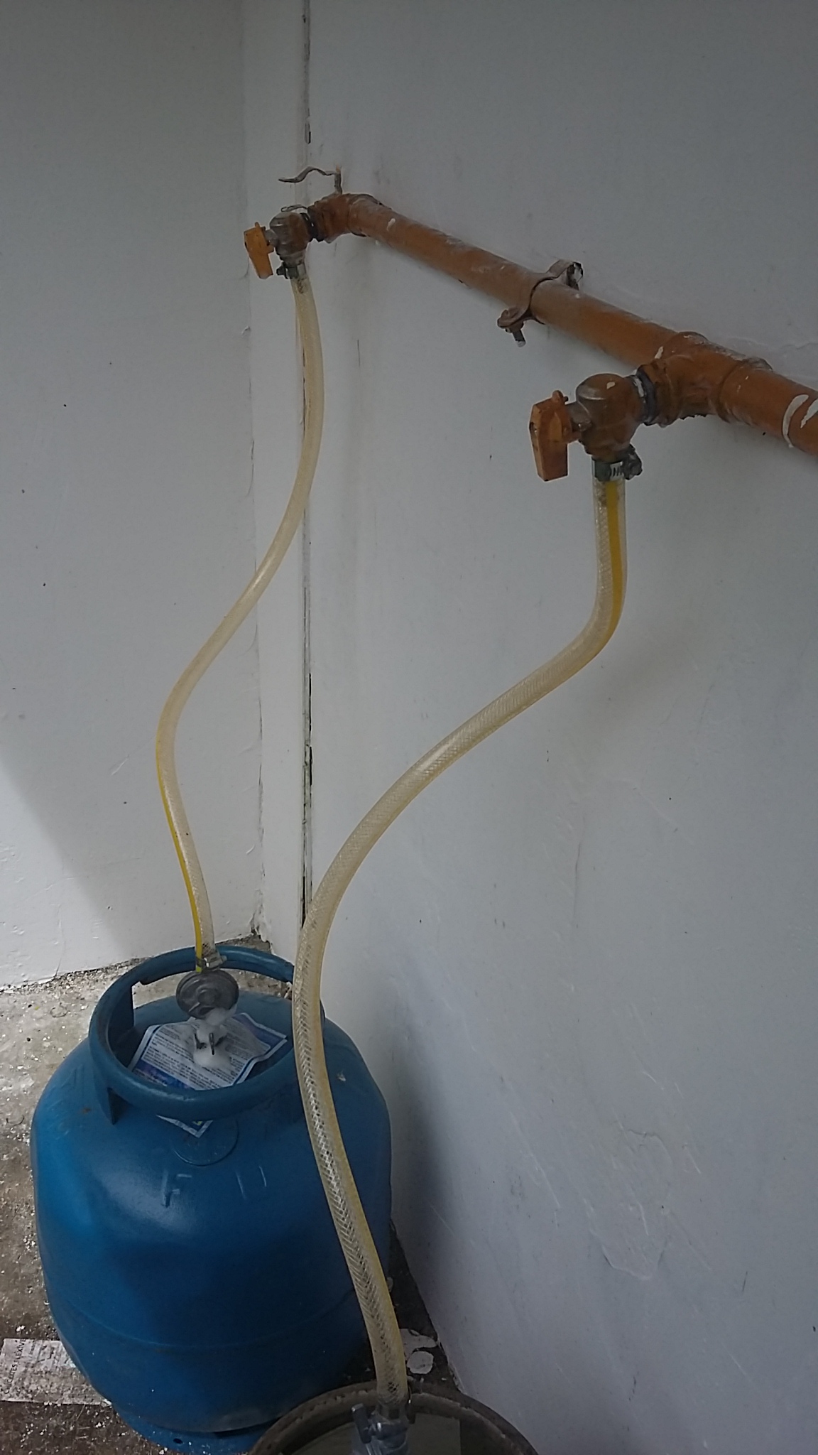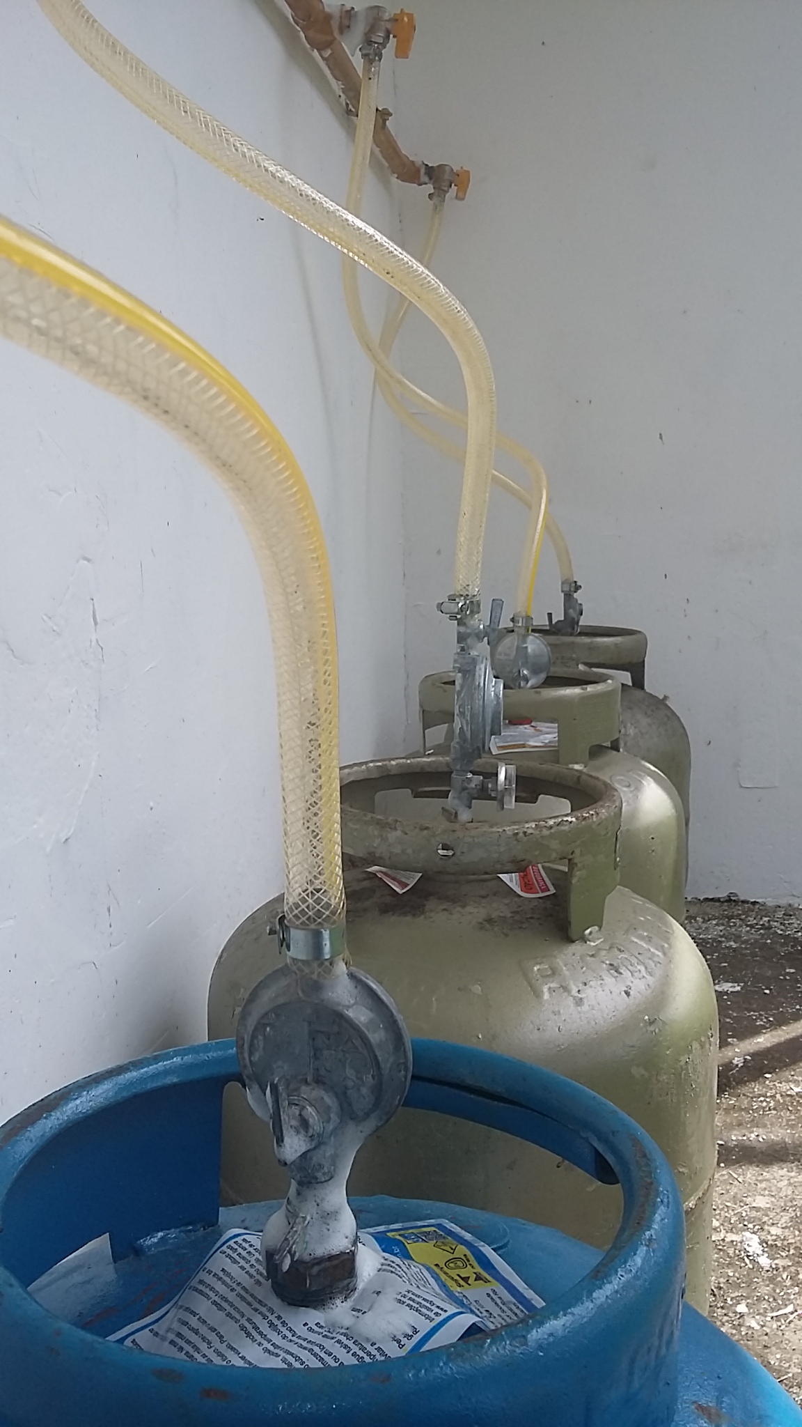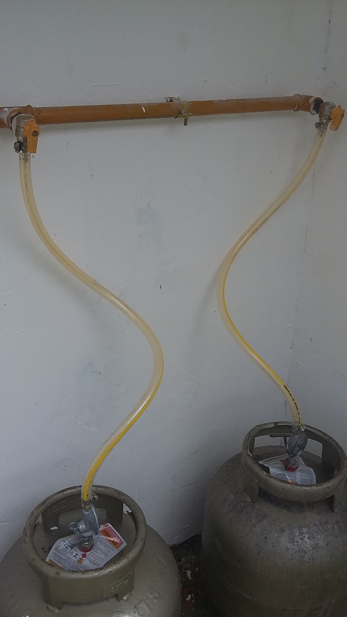 - Solução Adotada ajustado para Troca de material.Devido a várias incidências de vazamento com o material instalado anteriormente; Foi colocado _mangueira de poliéster com duas camadas de PVC flexível normatizada para gás, uso doméstico para GLP com regulador de pressão, – NBR 8613/99.